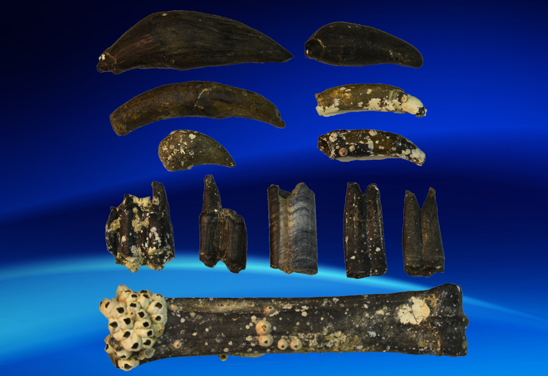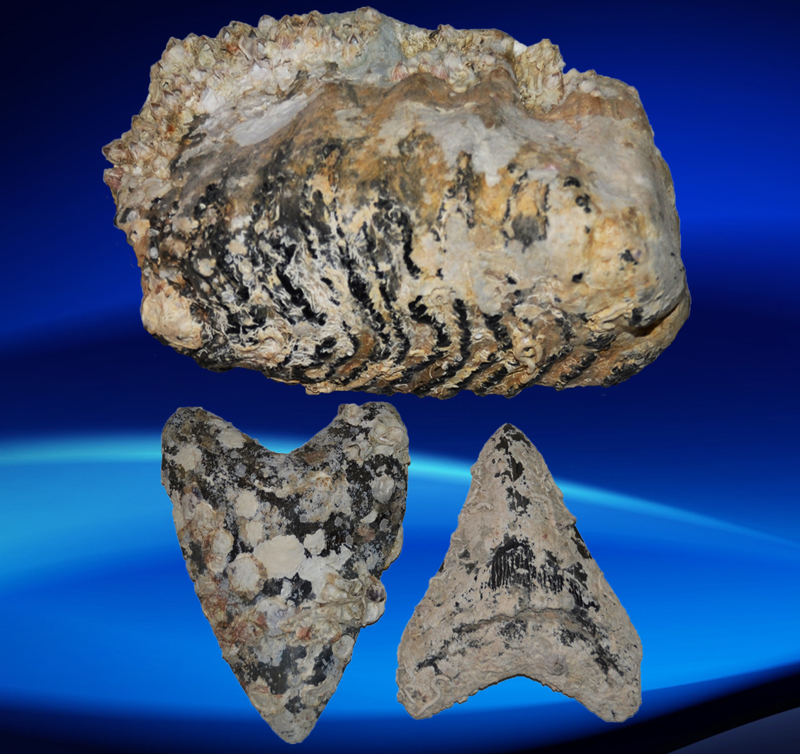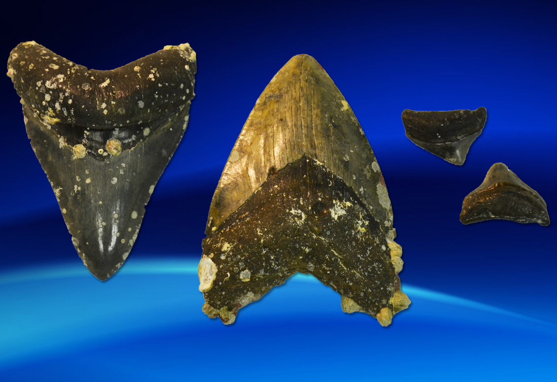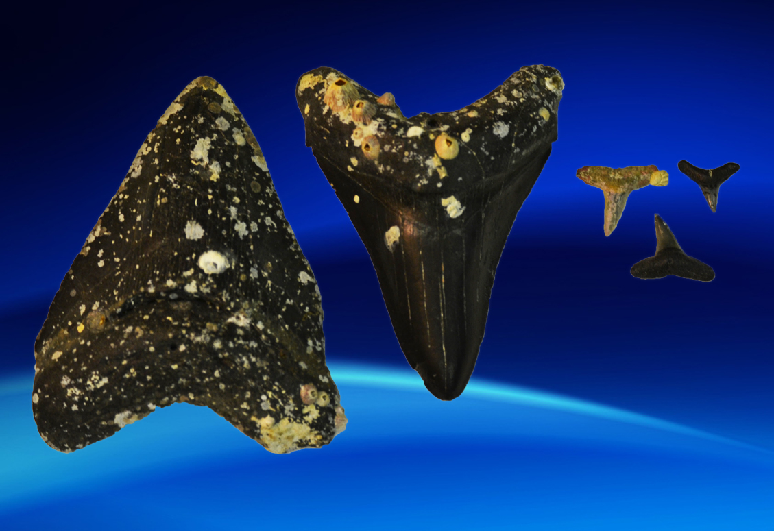 Above: Fossilized bull sharks teeth, modern great white sharks teeth, and extinct megalodon teeth (2 to 35 million years old).