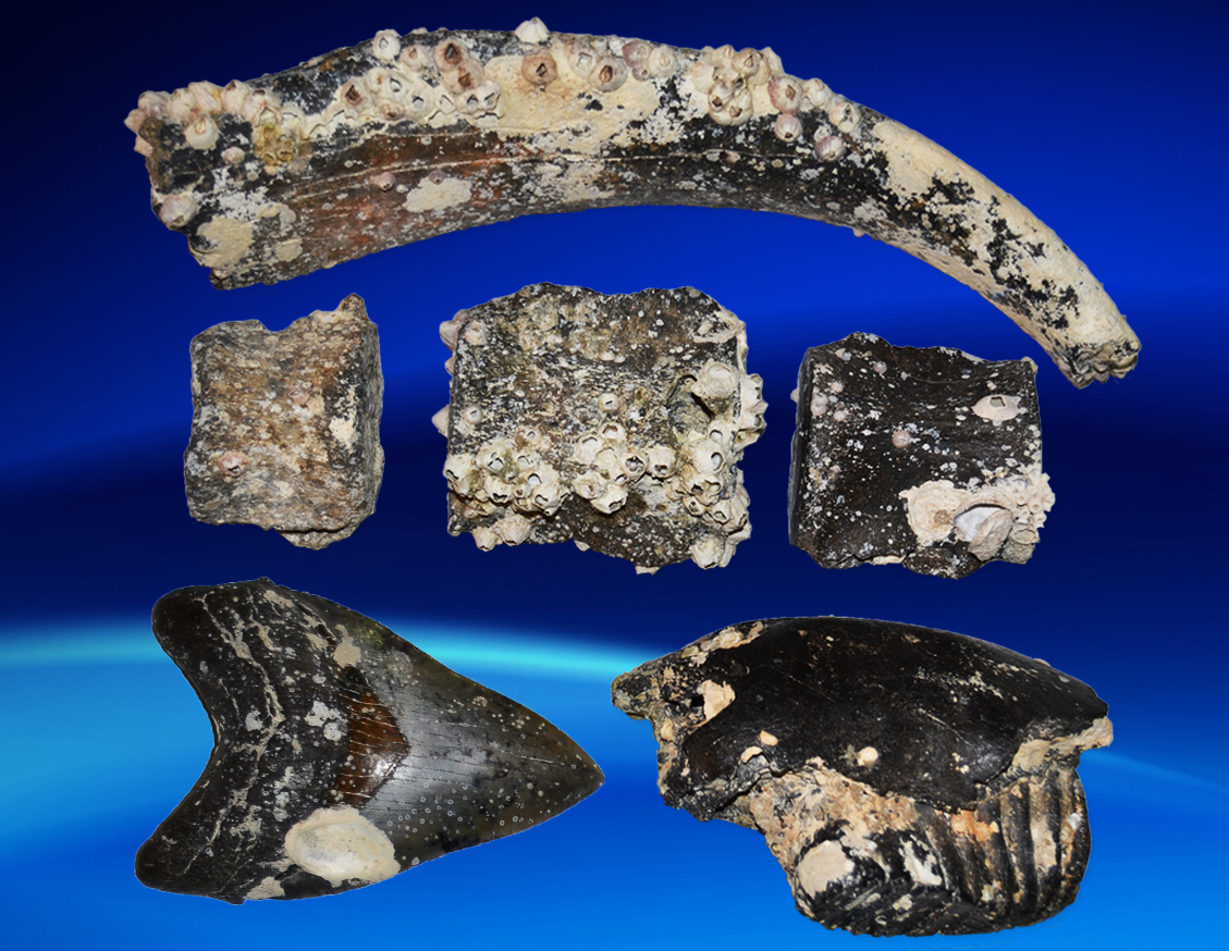 Below: Megalodon teeth and various fossilized mammoth, whale, horse, camel, sloth and bison teeth. Also, fossilized vertebrae and mammoth tusk.